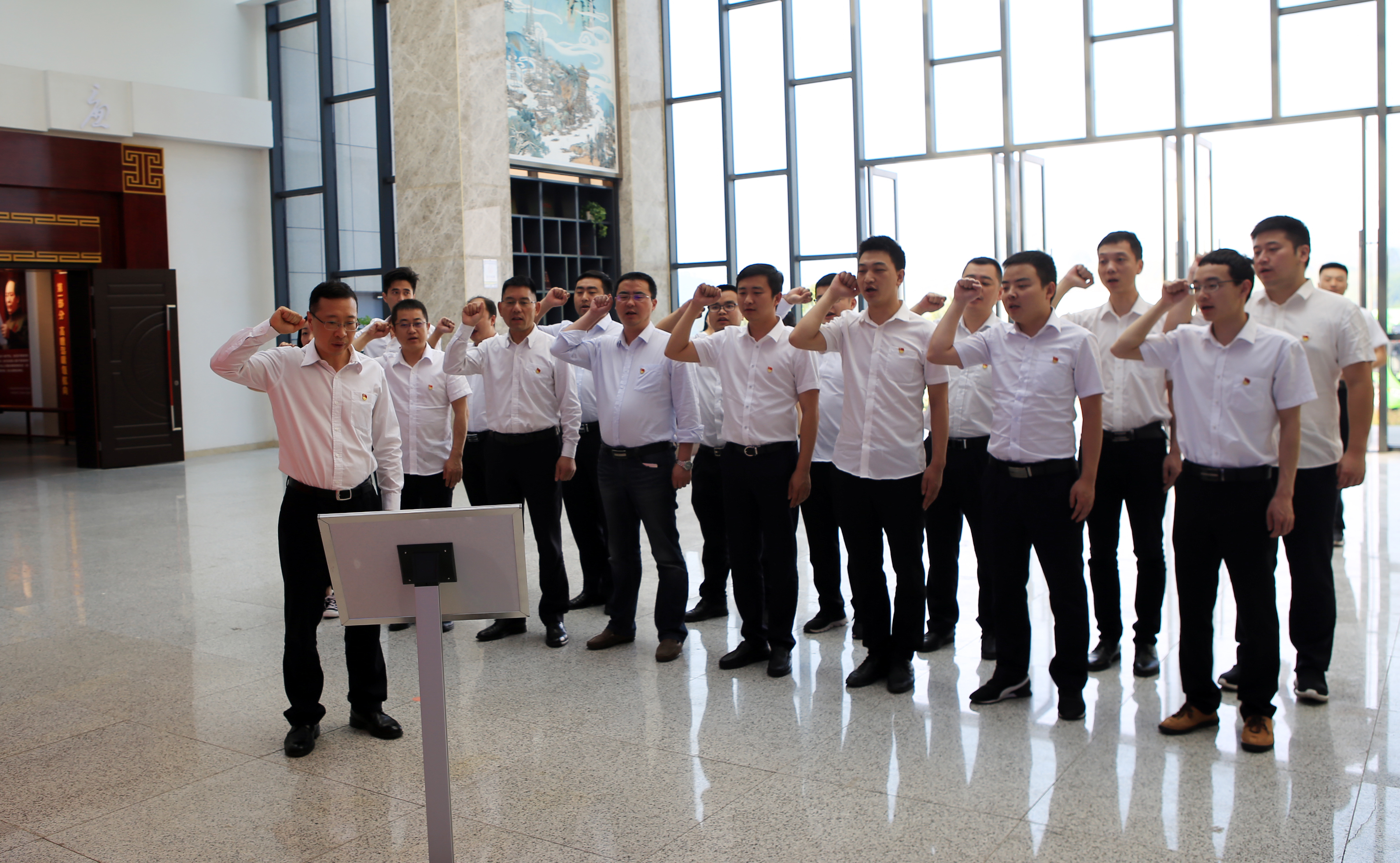全體參觀人員集中觀看了警示教育片《腐敗:糧倉里的拼圖》。在廉潔大廳,全體黨員干部在黨委副書記劉小波的帶領下重溫了入黨誓詞,再次莊嚴的面對黨旗宣誓。