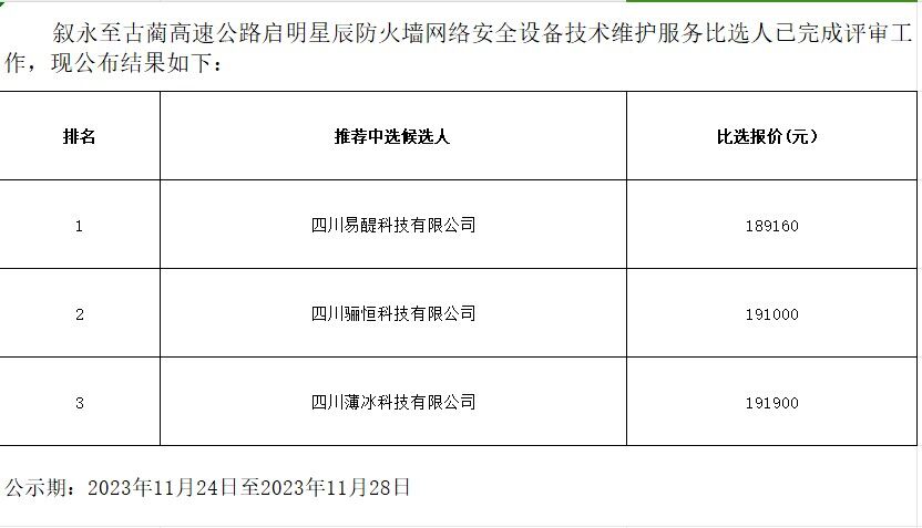 敘永至古藺高速公路啟明星辰防火墻網絡安全設備技術維護服務比選公告